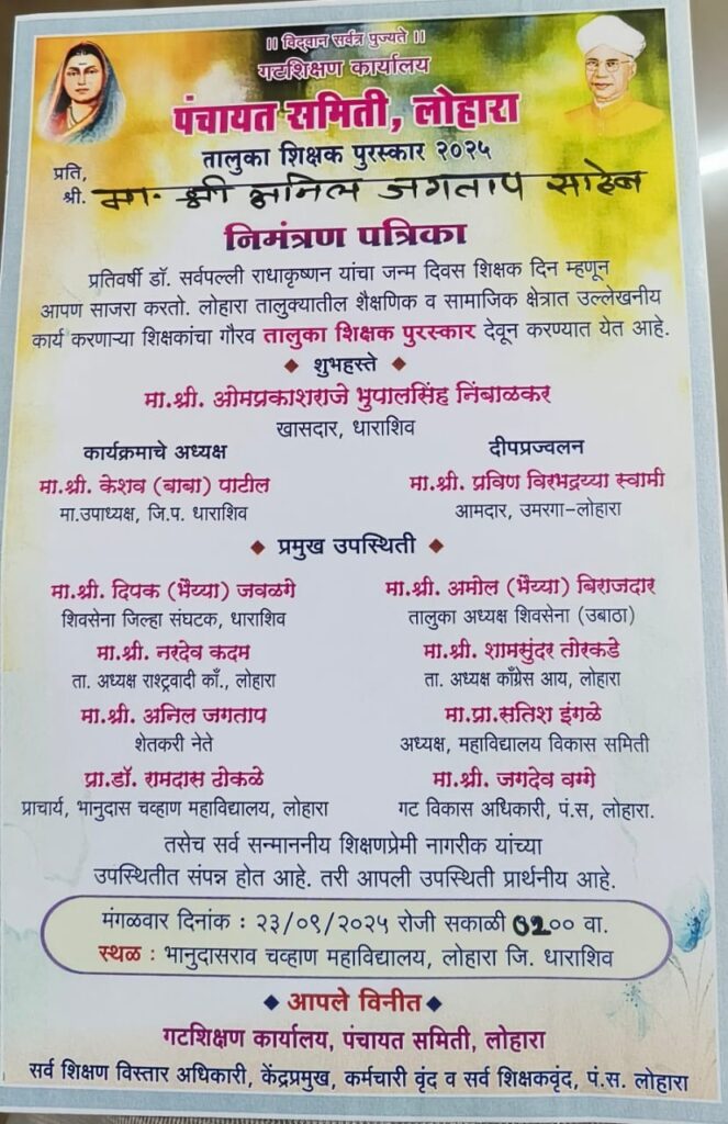 Lohara : गटशिक्षण अधिकारी कार्यालय लोहारा यांच्यावतीने उद्या दिनांक 23 सप्टेंबर रोजी तालुक्यातील बारा शिक्षकांचा आदर्श तालुका पुरस्काराने तसेच मुख्यमंत्री सुंदर माझी शाळा टप्पा क्रमांक दोन या कार्यक्रमांतर्गत तालुक्यातील सहा शाळांचा होणार गौरव.